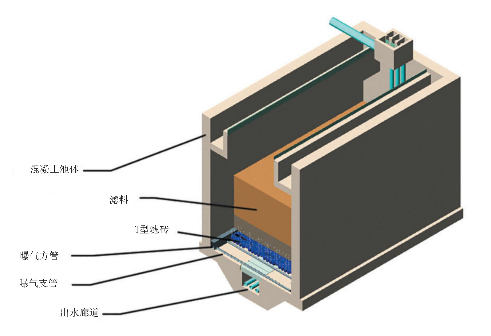 1. 過濾過程:待濾(lǜ)水(shuǐ)通過進水閥和方孔進入V型槽,經過均勻分布的配水孔進入濾池,濾後水通過長柄濾頭流入底部空間,最(zuì)終匯入清水池。