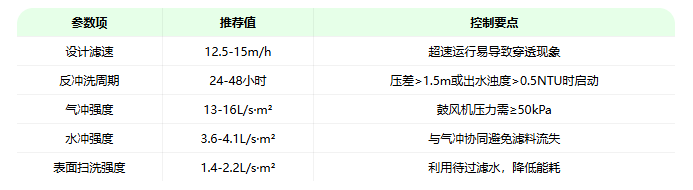 2. 反衝(chōng)洗過程:在反衝洗時,關閉進(jìn)水閥,部分進水通過常開的方孔流入濾池,形成表麵掃(sǎo)洗。反衝洗分為氣衝、氣水聯衝和水衝三個階段,確保濾料(liào)表麵的雜質被(bèi)有效清除。