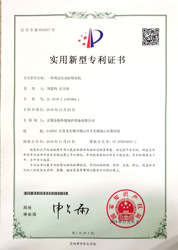 周(zhōu)邊傳動虹吸泥機專利(lì)證書