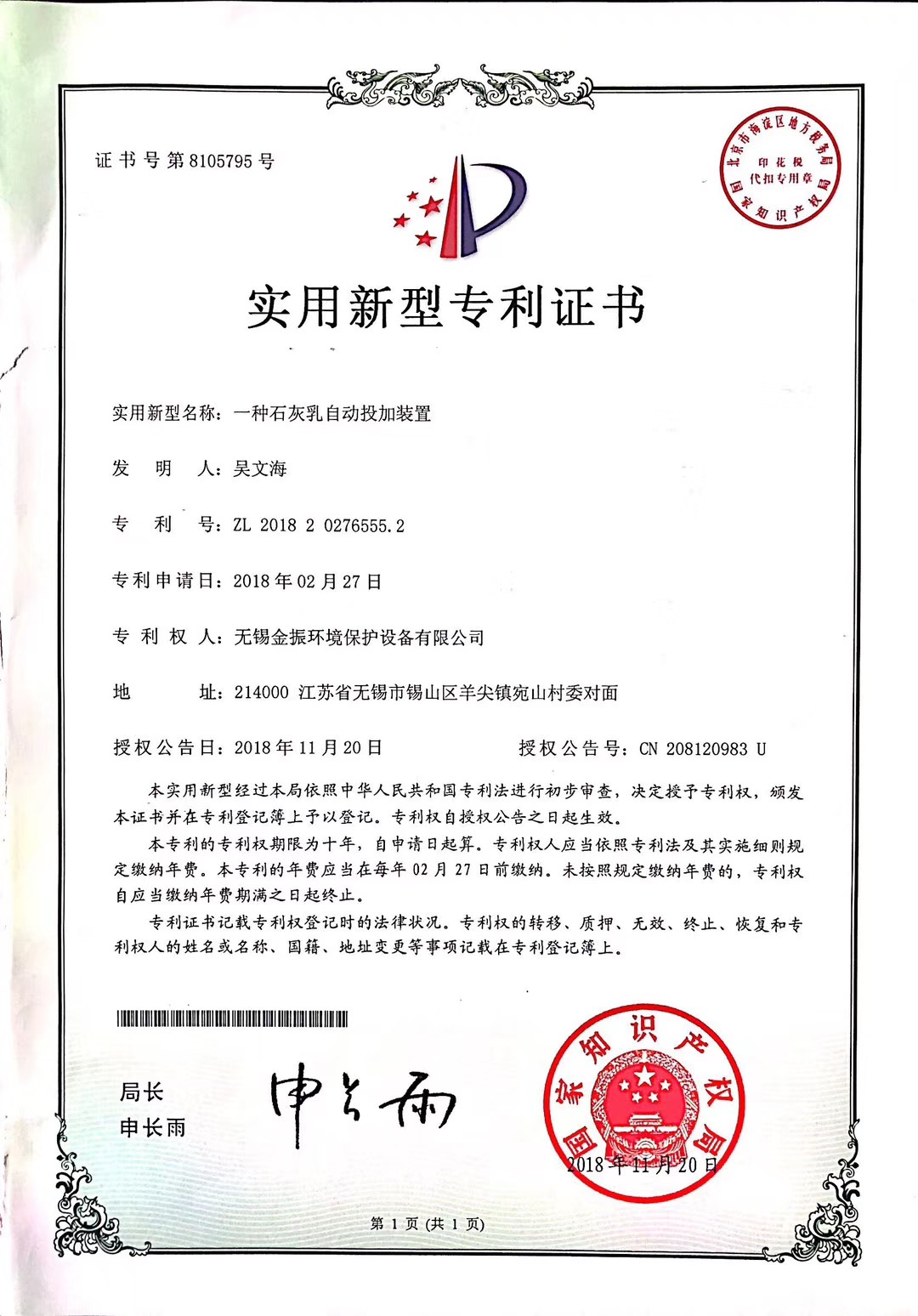 無(wú)錫www.17c.com.嗯嗯噜環境保護設備有限公(gōng)司又喜獲“一種(zhǒng)石灰乳自動投加裝置”一項目實用新型(xíng)專利(lì)證書,專利號為(wéi):ZL 2018 2 0276555.2 ,發明人:吳文海,授(shòu)權公告日:2018年11月20日。截止目前,無錫www.17c.com.嗯嗯噜環境保護設備有限公司(sī)已榮獲多項專利證書。